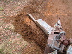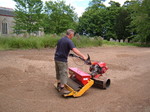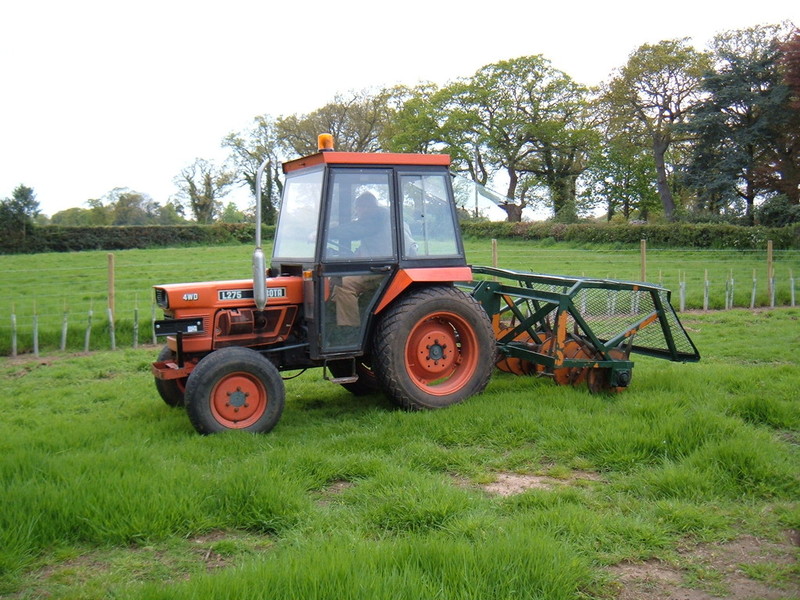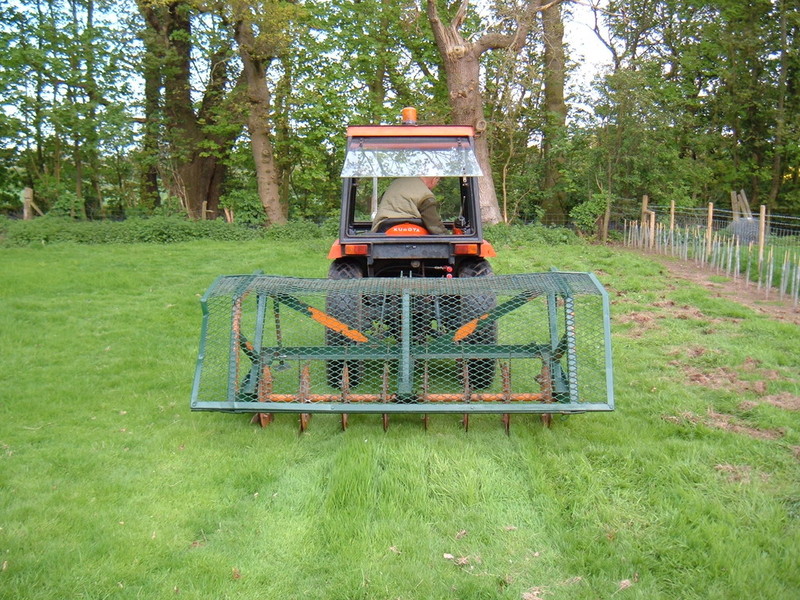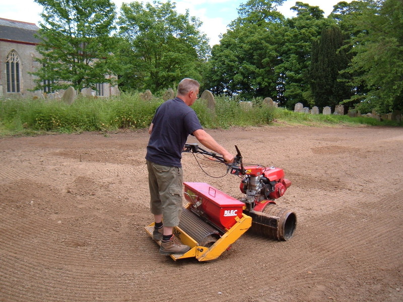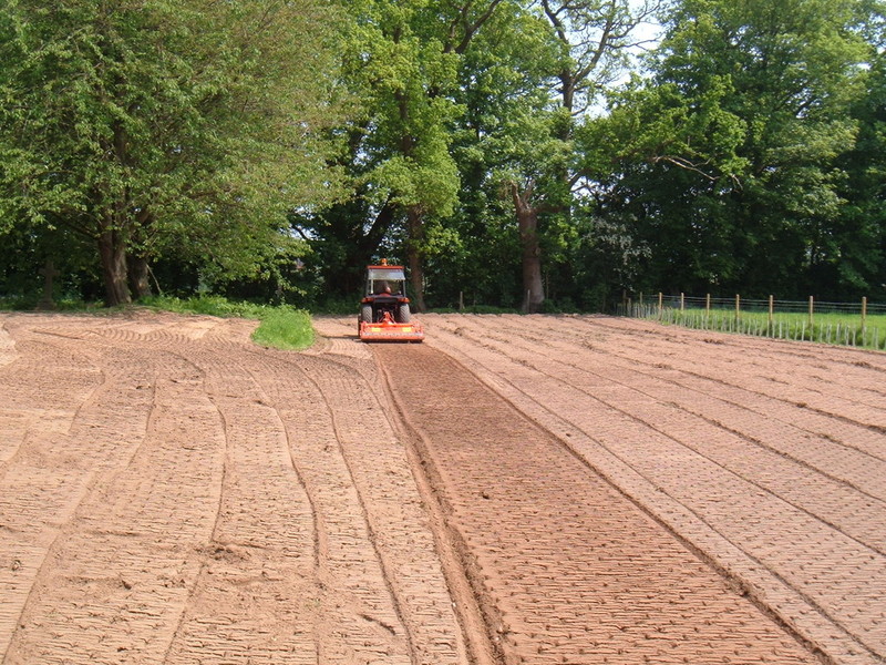 In the pictures above you can see the stone burier and the seeder in action, the stone burier operates by mixing up a large amount of soil then depositing larger stones at the bottom and then with a covering of fine soil. Site is then ready to be seeded by means of a ride on machine, which also firms and levels.